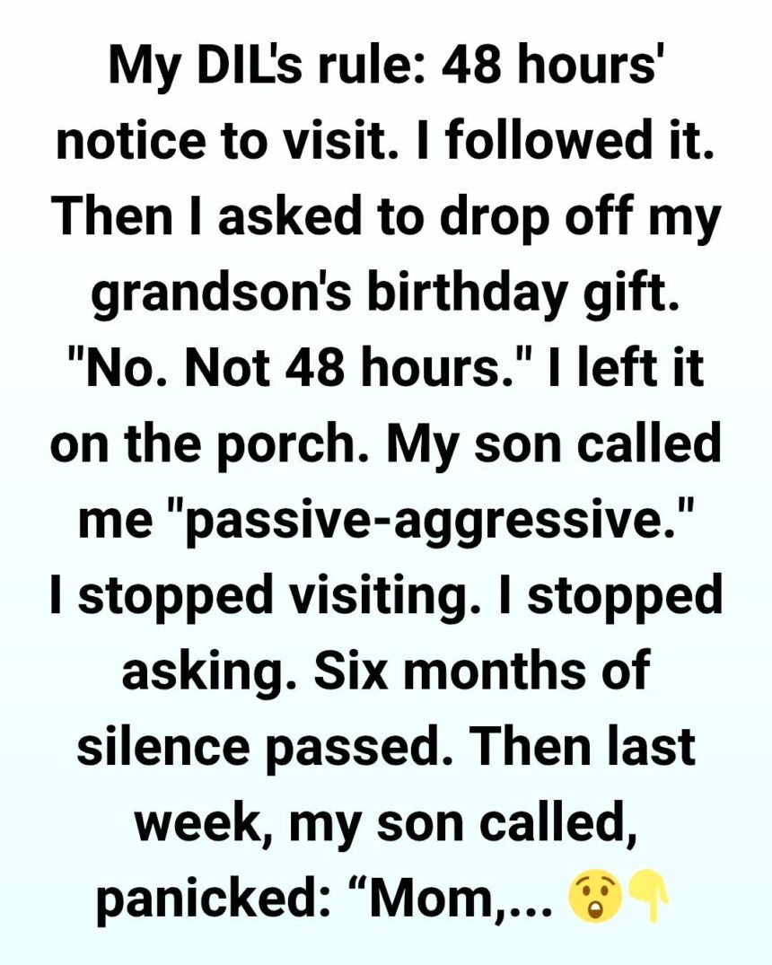 My daughter-in-law set a rule: I had to give 48 hours’ notice before visiting my grandson. I thought it was excessive, but I followed it faithfully because I didn’t want any conflict. I’d text her two days ahead, wait for her approval, and only visit at the exact time she allowed.