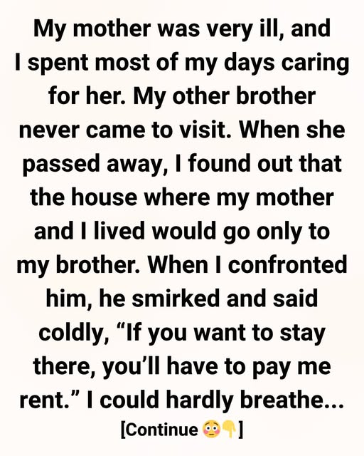 My name wasn’t even mentioned in that part of the will. When I confronted him, hoping it was all a misunderstanding, he smirked and said coldly, “If you want to stay there, you’ll have to pay me rent.” I could hardly breathe. Rent?