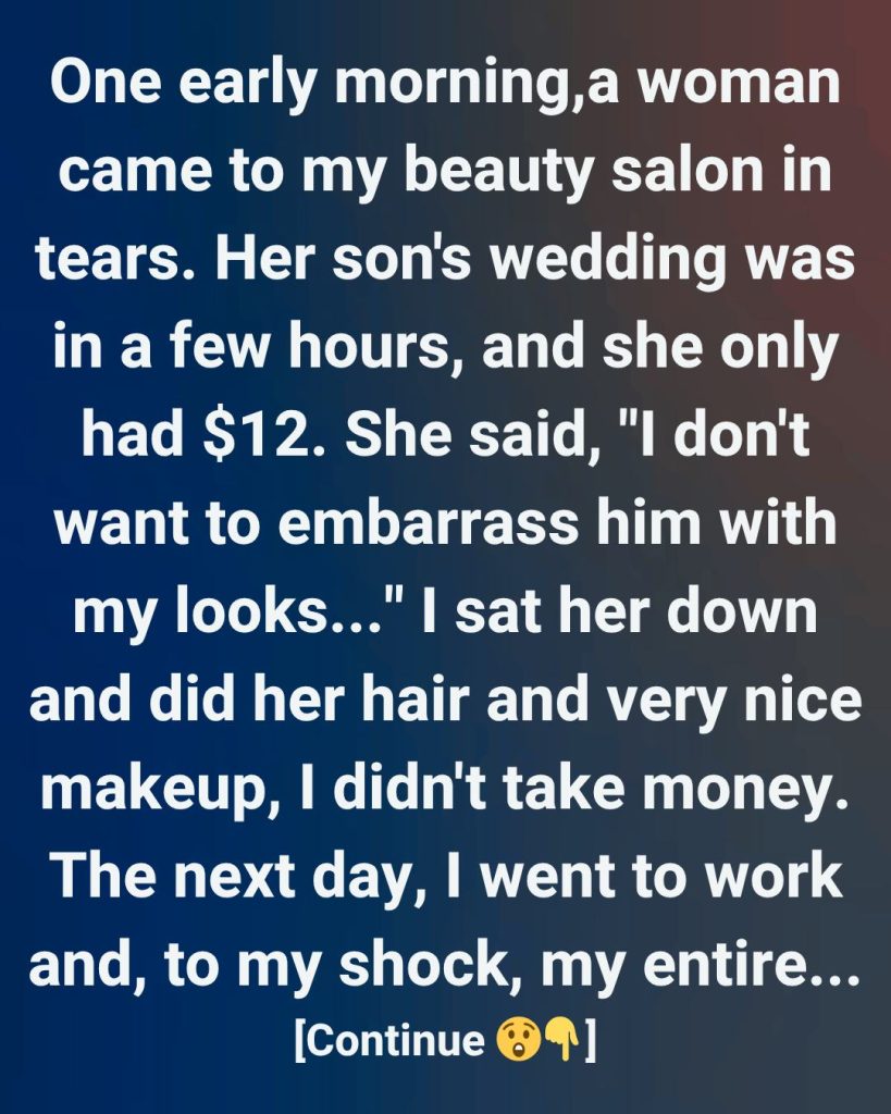 One early morning, a trembling woman walked into my salon, clutching a worn-out purse. Her eyes were swollen from crying. In a voice barely above a whisper, she said her son was getting married in just a few hours—and all she had was twelve dollars.