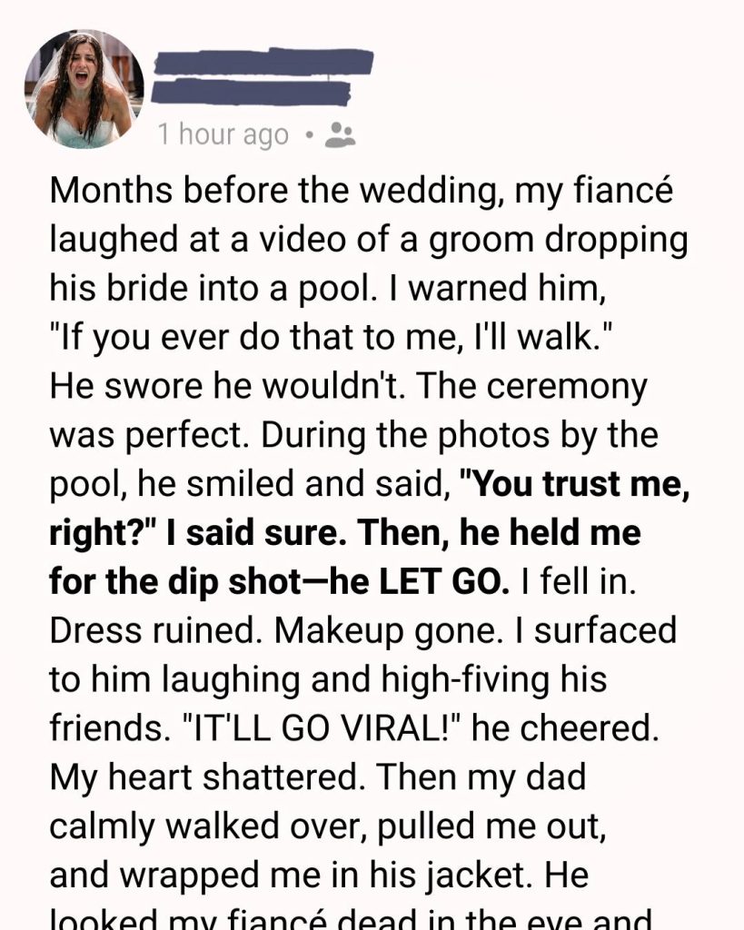 He calmly stepped forward, pulled me out of the pool, and wrapped his jacket around me like he’d done when I was little and scraped my knees. I pressed my face into his chest and finally cried. He looked at my fiancé—slowly, steadily—and said in a voice so calm it was terrifying, “Is this how you protect the woman you promised to honor?”