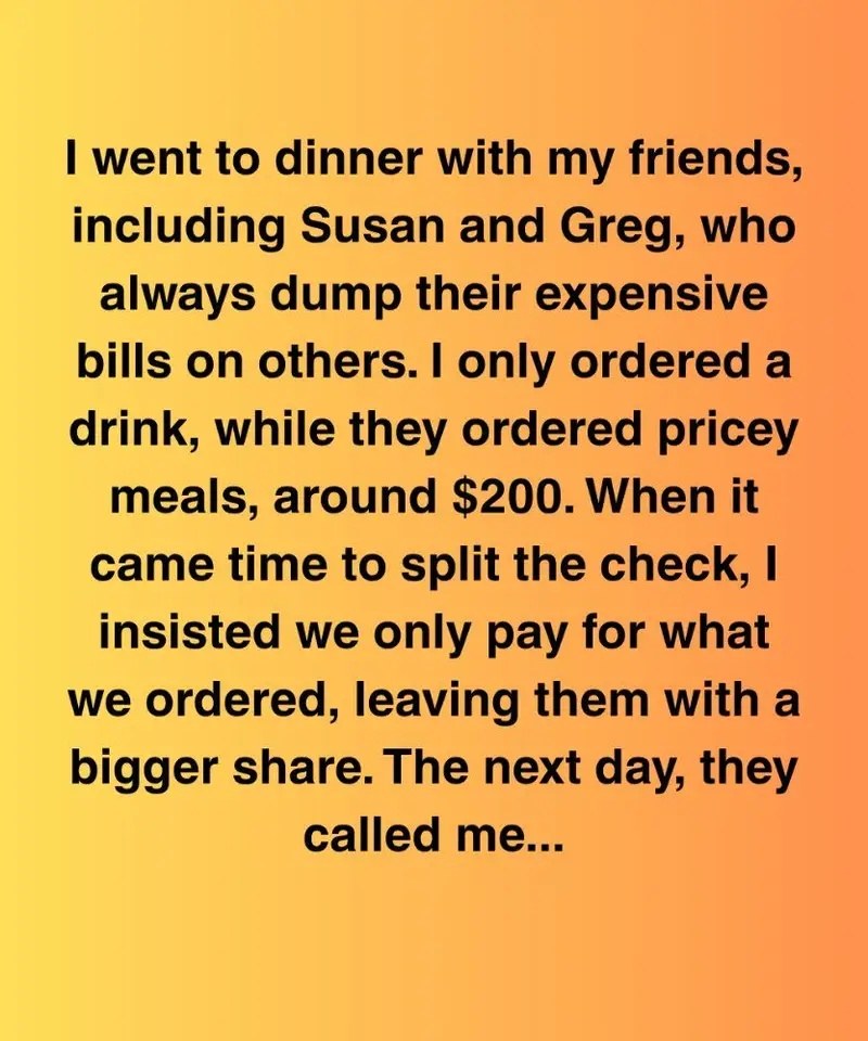 I went to dinner with my friends, including Susan and Greg, who always dump their expensive bills on others. I only ordered a drink, while they ordered pricey meals, around $200. When it came time to split the check, I insisted we only pay for what we ordered, leaving them with a bigger share.