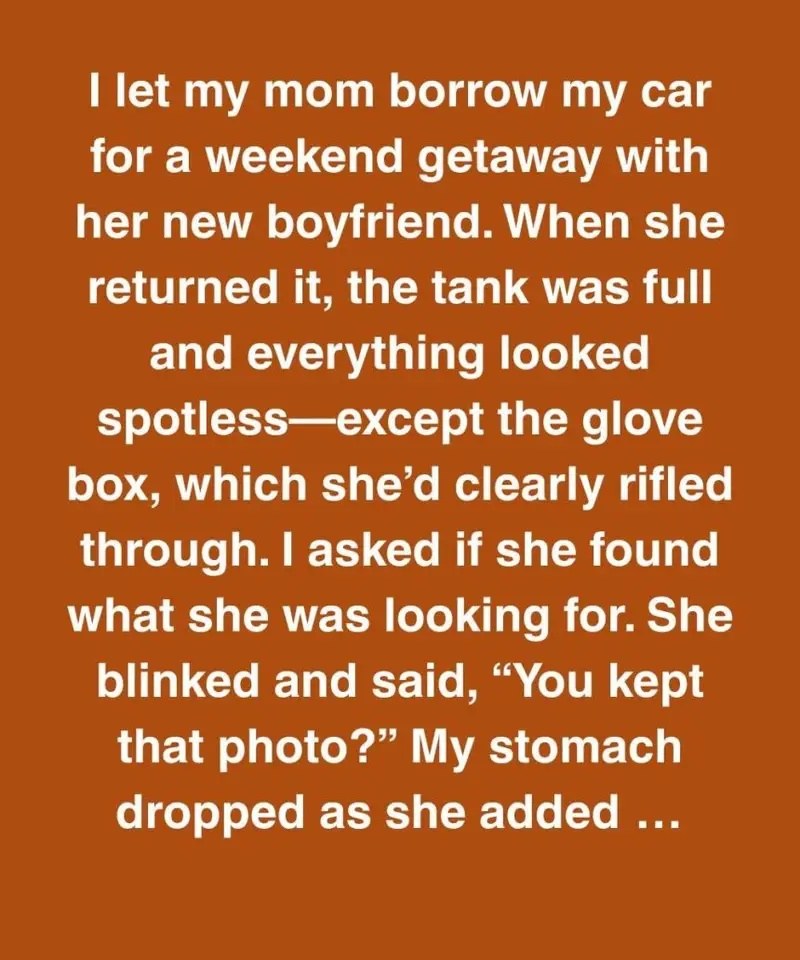 I let my mom borrow my car for a weekend getaway with her new boyfriend. When she returned it, the tank was full and everything looked spotless—except the glove box, which she’d clearly rifled through. I asked if she found what she was looking for.