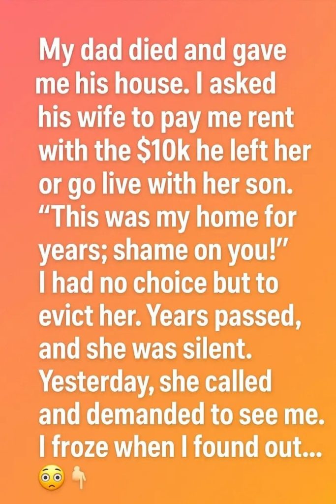 My dad died and gave me his house. I asked his wife to either pay rent with the money he had left her or move in with her son. She refused, saying, “This was my home for years; shame on you!”