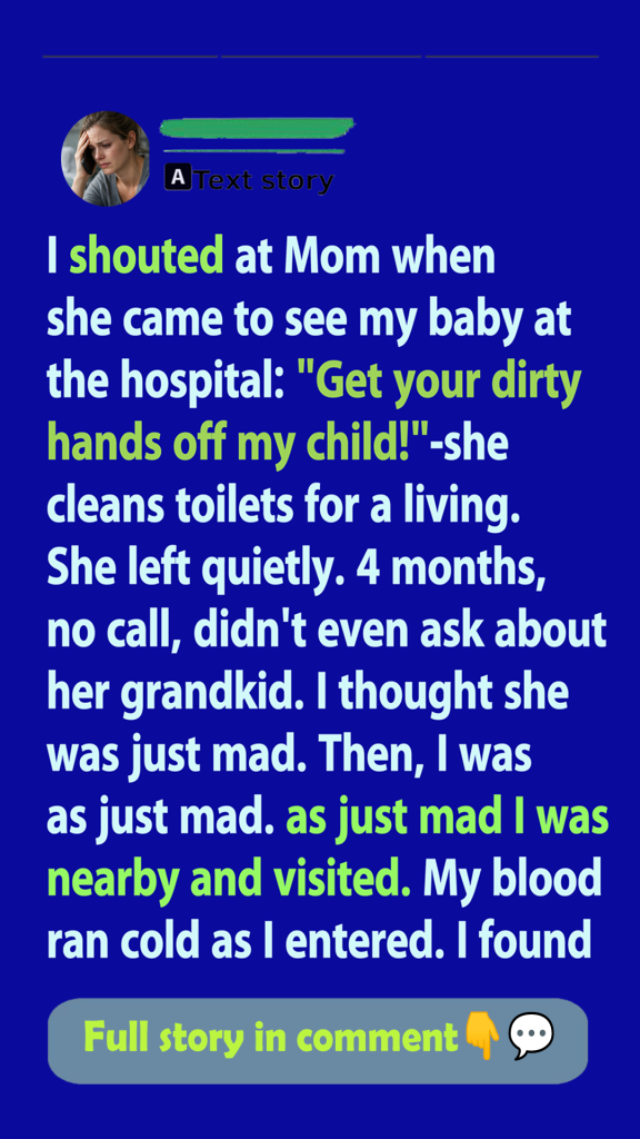 At the time, I felt justified. Exhausted. Overwhelmed. Ashamed in ways I didn’t know how to name. My mother cleaned toilets for a living—office buildings, train stations, anywhere that needed someone invisible to scrub away other people’s messes. I had spent years pretending that didn’t bother me. But there, in that pristine hospital room, holding my perfect baby, all my buried resentment spilled out in one unforgivable sentence.