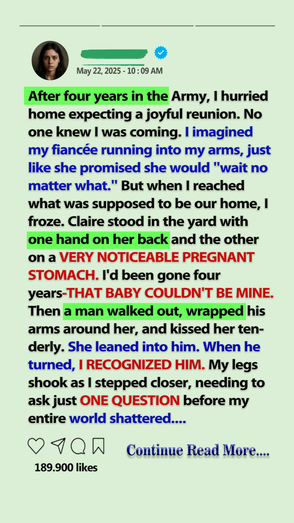 I came home from a four-year deployment expecting a tearful reunion. Instead, I found my fiancée in the yard—hugged, kissed, and very pregnant. And the man holding her was the last person I ever expected.