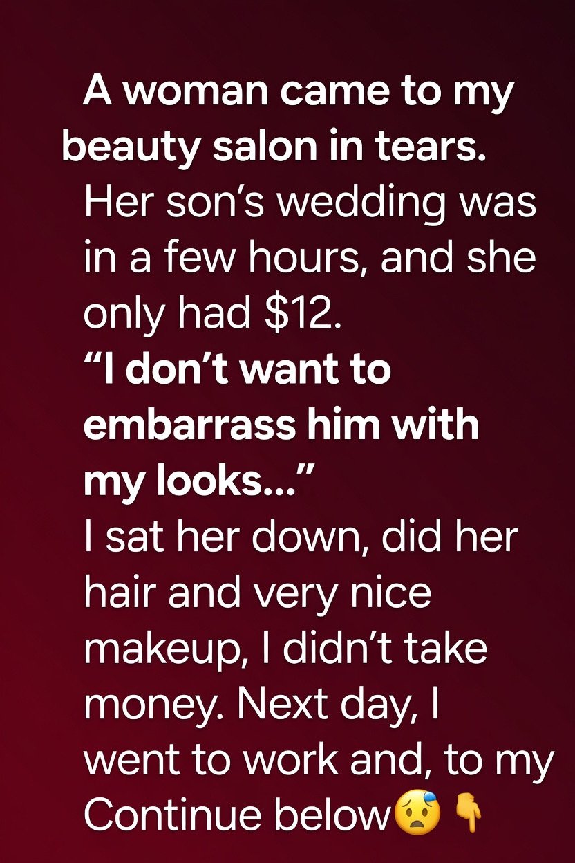 A woman came to my beauty salon in tears. Her son’s wedding was in a few hours, and she only had $12. “I don’t want to embarrass him with my looks,” she whispered, her voice trembling.