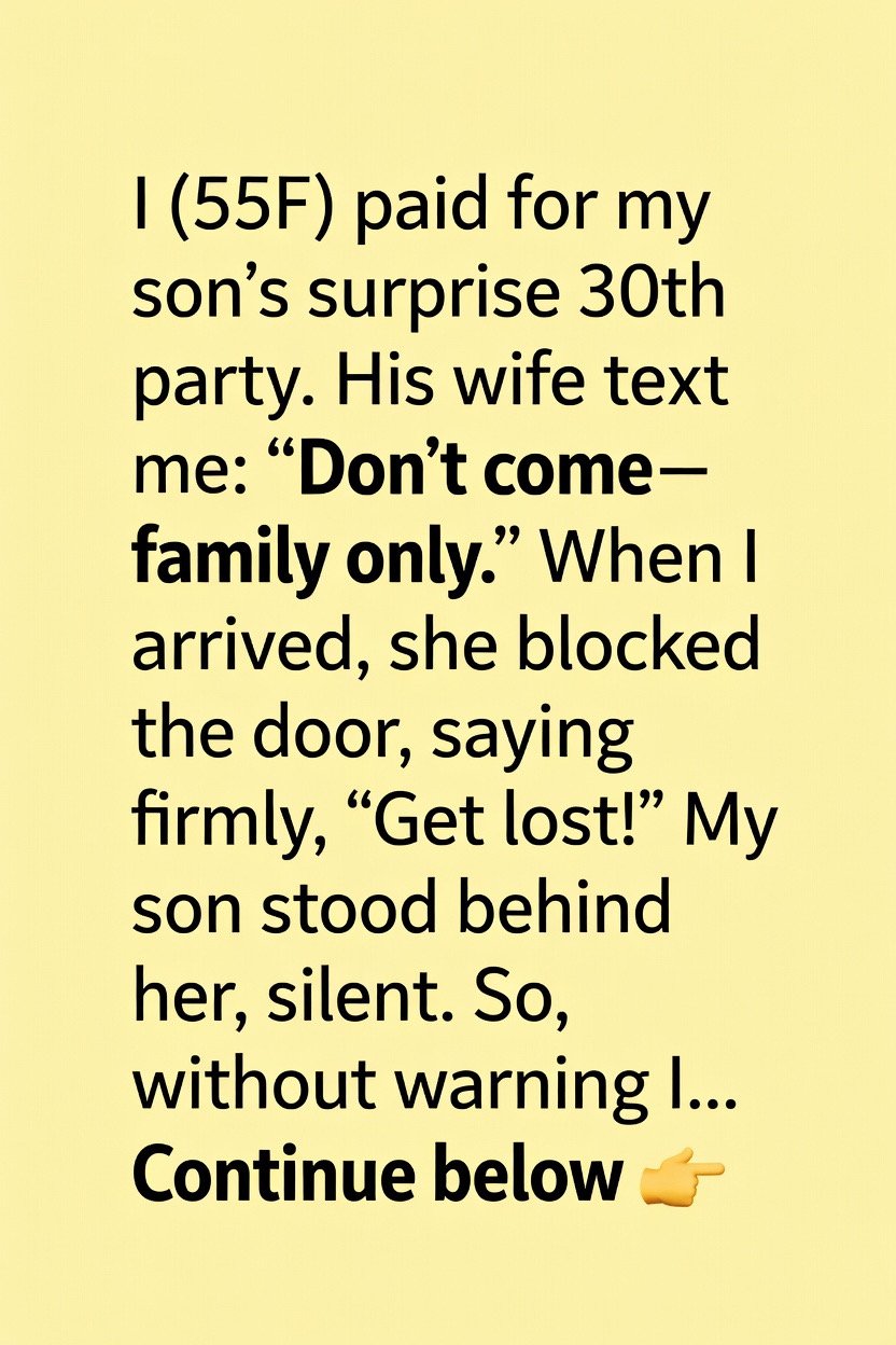 I (55F) paid for my son’s surprise 30th birthday party. His wife texted me, “Don’t come — family only.” When I arrived, she blocked the door, saying firmly, “Get lost!” My son stood behind her, silent. So, without warning them, I turned and quietly left — but not before making one last stop that would change everything.