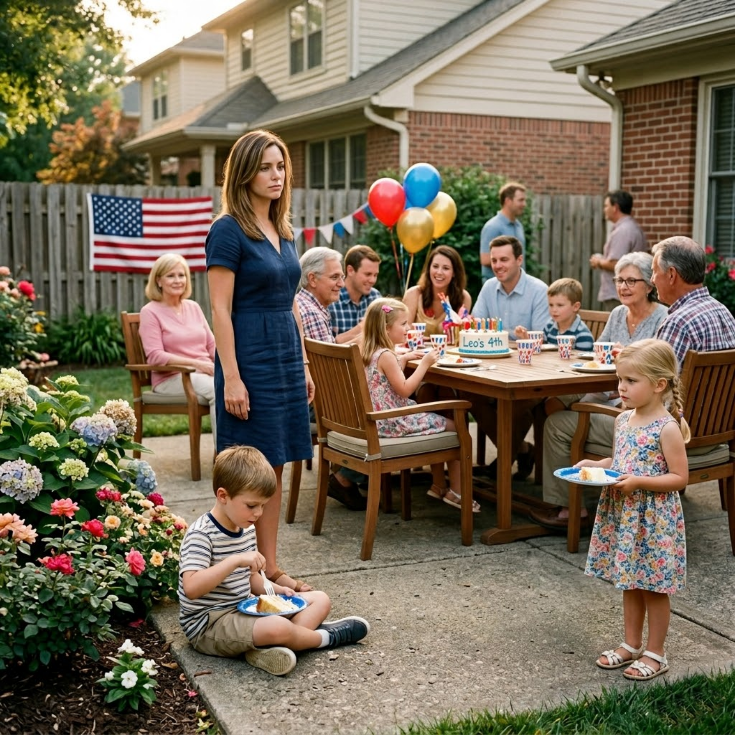 The image did not hit me all at once. It came slowly, almost mercifully, as I stepped out through the back door and onto the patio, like my own mind was trying to spare me from seeing it clearly even though it was right there in front of me in plain sight. My son was sitting on the concrete with a paper plate balanced on one knee, not near a chair, not close to the folding tables where the other children were crowded shoulder to shoulder under bunches of red and blue balloons, but off to the side in that strangely deliberate way people create when they want to pretend something just happened naturally. His little legs were folded awkwardly beneath him, sneakers flat against the warm patio, and he was eating with the serious concentration children have when they know one wrong move means their food will slide off the plate and spill into their lap.