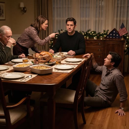 One second he was standing at the end of the dining table with his fork still in his hand, face flushed red with disbelief. The next, his knees buckled and he folded down onto the hardwood, shoulders shaking, sobbing so loudly his wife rushed forward as if she might have to call an ambulance. His kids stared from the hallway, wide-eyed, and my mother’s voice rose into a pitch I hadn’t heard since I was a teenager being scolded for existing wrong.