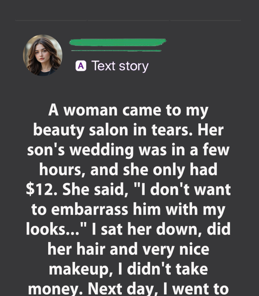• A woman came to my beauty salon in tears. Her son’s wedding was in a few hours, and she only had $12. She said, “I don’t want to embarrass him with my looks…” I sat her down, did her hair and makeup for free.