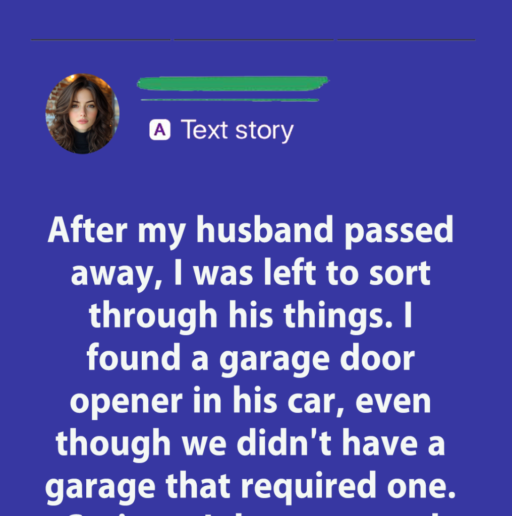 • After my husband passed away, I was left to sort through his things. While cleaning out his car, I found a garage door opener tucked in the glove compartment. It was odd because we didn’t have a garage that needed an opener, and his work parking didn’t use one either. I shrugged it off, thinking it might have been a mistake or something he forgot to return.