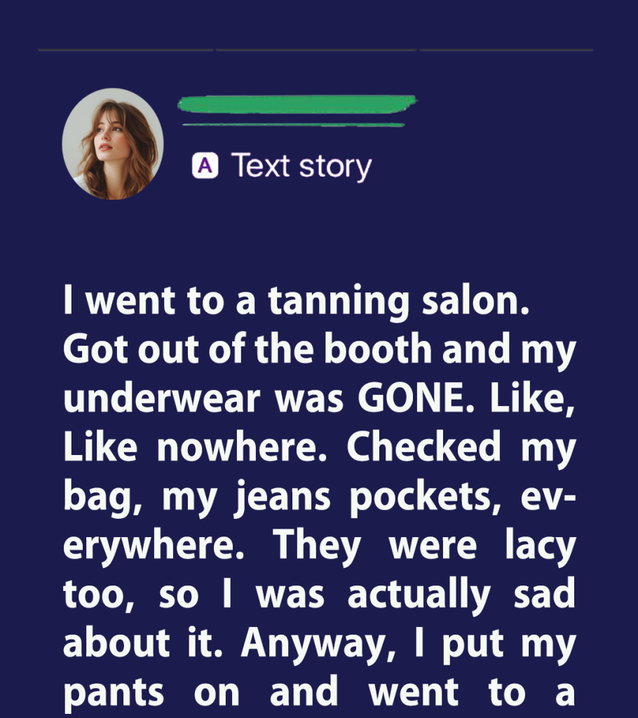 So I went to a tanning salon the other day. Got out of the booth, getting dressed… and my underwear was GONE. Like, nowhere. Checked my bag, my jeans pockets, everywhere. Nope. Nothing. They were lacy too, so I was actually sad about it. Anyway, I put my pants on, left super confused. Went to a store afterwards still thinking, “Where the hell are my panties?” And then it hit me. I had used them to tie up my hair inside the booth because I didn’t have a scrunchie. So yes… I walked around the street and into a store with lace panties in my hair