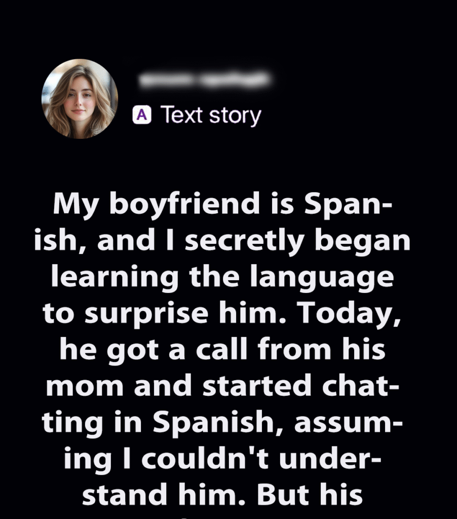 • My boyfriend is Spanish, and I secretly began learning the language to surprise him. Today, he got a call from his mom and started chatting in Spanish, assuming I couldn’t understand him. But his words left me stunned.