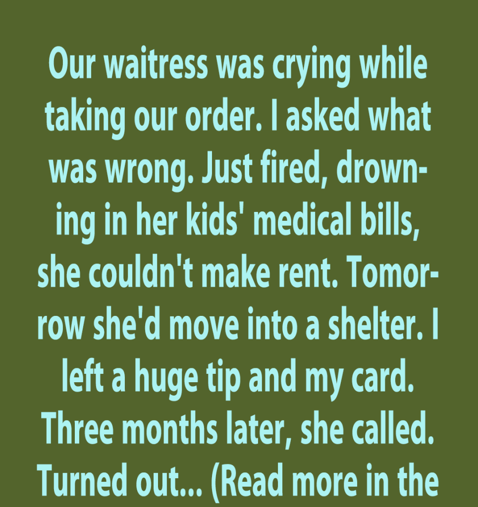 - Our waitress was crying while taking our order. I asked what was wrong. Just fired, drowning in her kids’ medical bills, she couldn’t make rent. Tomorrow she’d move into a shelter. I left a huge tip and my card.