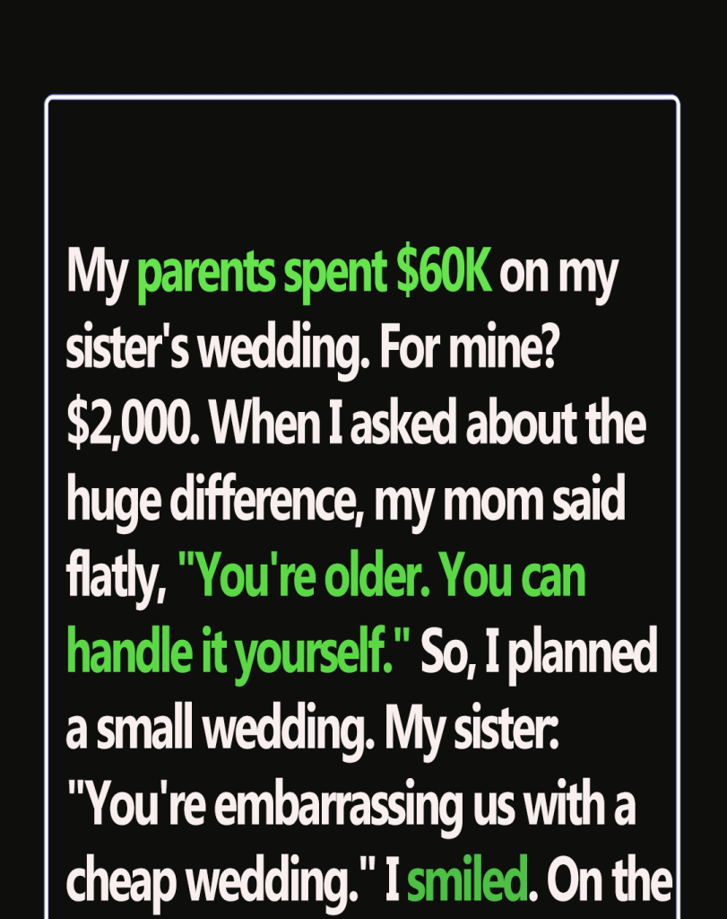 I didn’t argue. I smiled, thanked them for the $2,000, and started planning a smaller wedding with my fiancé. Then my sister called two months before the wedding. “This cheap wedding is going to embarrass the whole family.” I took a breath and just said, “Noted,” then hung up.