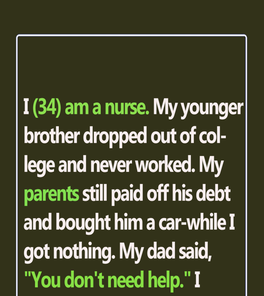 I (34) am a nurse. My younger brother dropped out of college and never worked. My parents still paid off his debt and bought him a car—while I got nothing. My dad said, “You don’t need help.” I stayed silent.