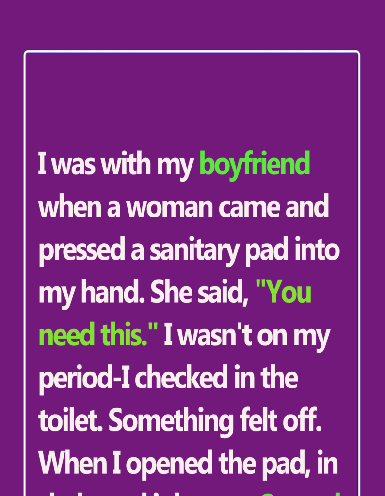 I was with my boyfriend when a woman came and pressed a sanitary pad into my hand. She said, “You need this.” I wasn’t on my period—I checked in the toilet. Something felt off. When I opened the pad, in shaky red ink and frantic writing, were two words: “Google him.”