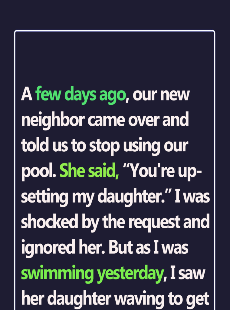 A few days ago, the mom came over and angrily told us, “Stop using your pool. You’re upsetting my daughter.” I was shocked by her request and after discussing it, my husband and I decided to ignore her. It was our house, and we could do whatever we wanted, after all.