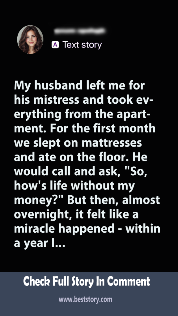 My husband left me for his mistress and took everything from the apartment. For the first month we slept on mattresses and ate on the floor. He would call and ask, “So, how’s life without my money?” But then, almost overnight, it felt like a miracle happened — within a year I learned something priceless: strength grows where tears once fell.