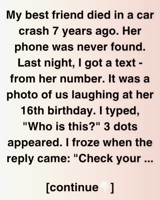 My best friend perished in a vehicle crash 7 years ago. No one found her phone. A SMS from her number arrived last night. A photo of us giggling during her 16th birthday. I typed “Who is this?” We saw 3 dots. I froze when told, “Check your”