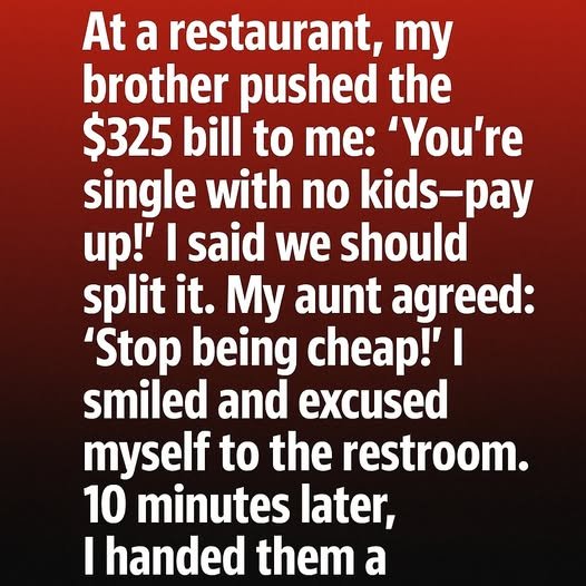 At a restaurant, my brother pushed the $325 bill to me: “You’re single with no kids—pay up!” I said we should split it. My aunt agreed, “Stop being cheap!” I smiled and excused myself to the restroom. Ten minutes later, I handed them a receipt showing the full payment—already covered.