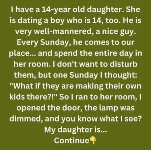 Every Sunday, he comes to our place… and spends the entire day in her room. I don’t want to disturb them, but one Sunday I thought: “What if they are making their own kids there?!” So I ran to her room, I opened the door, the lamp was dimmed, and you know what I see? My daughter is…sitting on the floor, headphones on, completely absorbed in helping him study for his math exam.