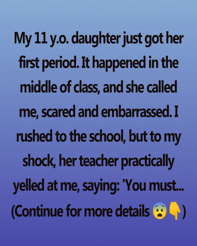 “My 11 y.o. daughter just got her first period. It happened in the middle of class, and she called me, scared and embarrassed. I rushed to the school, but to my shock, her teacher practically yelled at me, saying: ’You must have taught her better! Why didn’t you prepare her for this?’