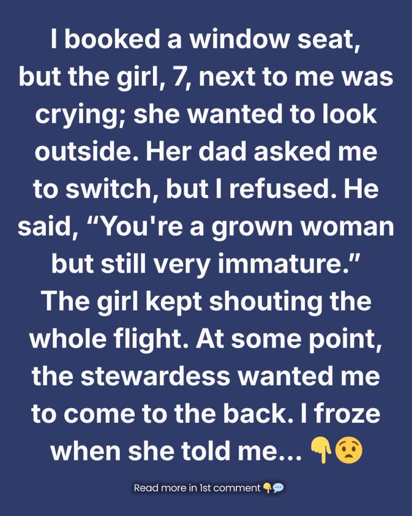 I had specifically booked a window seat for my flight. I’m the kind of traveler who likes watching the world shrink beneath the clouds, so I always make sure to reserve that spot. But as soon as I sat down, the little 7-year-old girl next to me burst into tears. She kept insisting she had to look outside, and her father immediately leaned over and asked if I could switch seats with her.