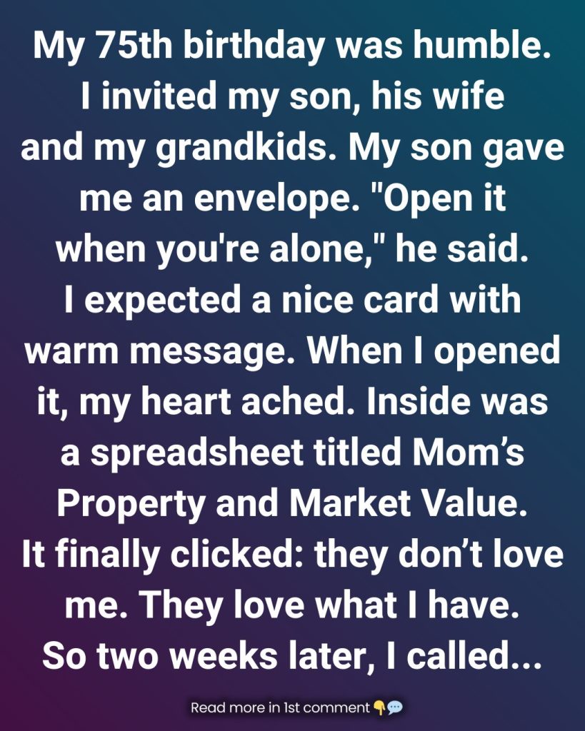 Later that night, I opened it. It wasn’t a card at all. It was a spreadsheet titled “Mom’s Property and Market Value.” Every possession I own—my house, jewelry, even my small stock portfolio—had notes about who should get what. Everything neatly itemized like I was a storage unit they were planning to empty.