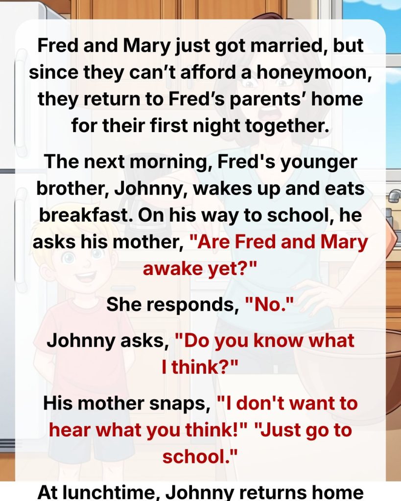 The next morning, Fred’s younger brother, Johnny, wakes up and eats breakfast. On his way to school, he asks his mother, “Are Fred and Mary awake yet?”
