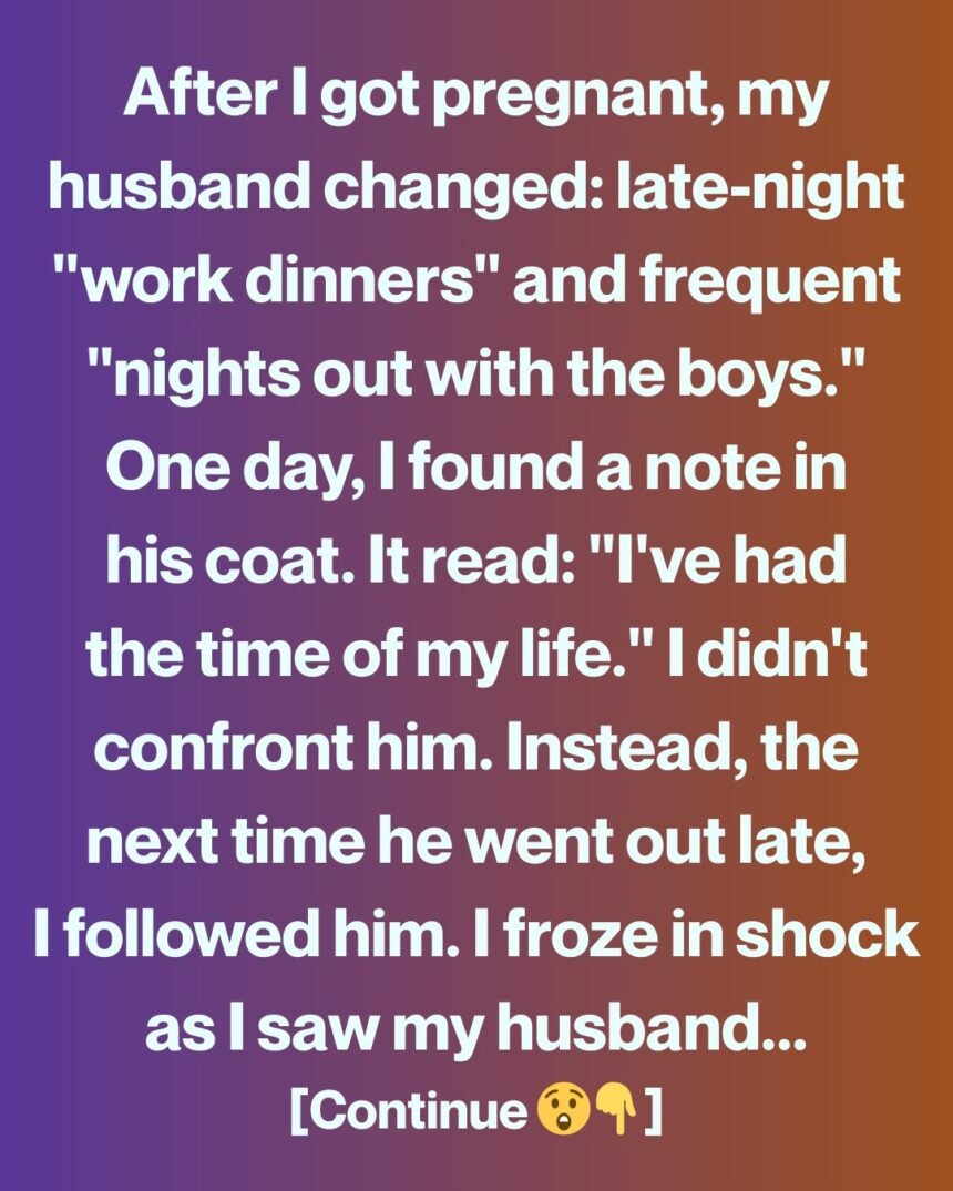 After I got pregnant, my husband changed—late-night “work dinners,” frequent “nights out with the boys.” His excuses kept piling up, and so did my worries. One afternoon, while sorting the laundry, a small folded note slipped out of his coat pocket. It read: “I’ve had the time of my life.”