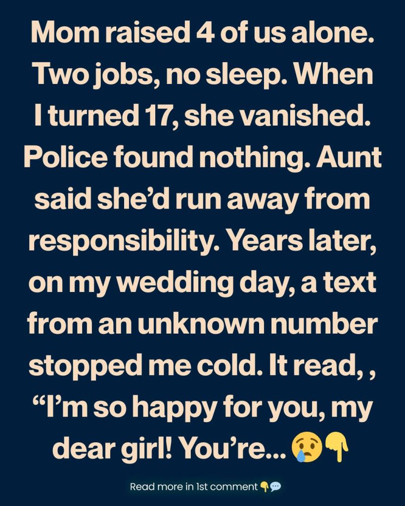 Mom raised the four of us on her own. Two jobs, endless overtime, barely a moment of sleep. I grew up watching her hands tremble from exhaustion, yet she never once complained. She was the strongest person I knew—until the day she vanished. I was seventeen. One morning she simply wasn’t there. No note, no call. Just silence.
