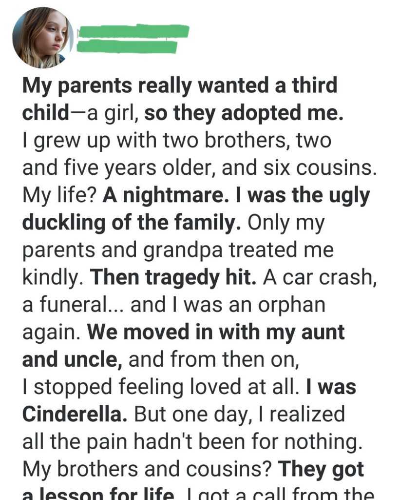 I grew up with two older brothers and six cousins who orbited our home like a loud, glittering universe. But while they shone bright, I always felt like a dim star—present, but unnoticed. My cousins whispered that I didn’t look like anyone. My brothers joked that I was “free,” a bargain-bin addition to the family. I laughed with them, even when the laughter hurt.