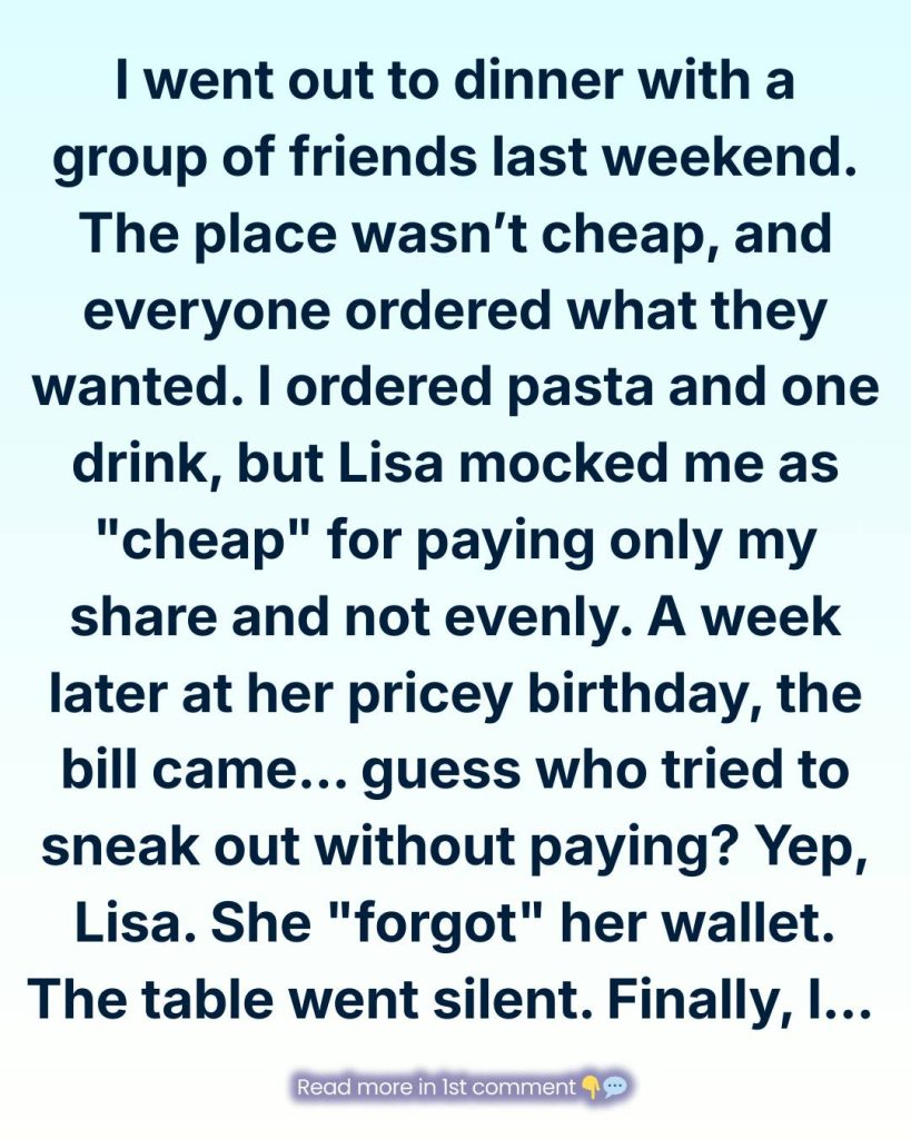 At first, I forced a laugh, hoping she was joking. But then she leaned forward, her voice loud enough that people at nearby tables turned to look. “Seriously, if you can’t afford to eat out, maybe you shouldn’t come.”