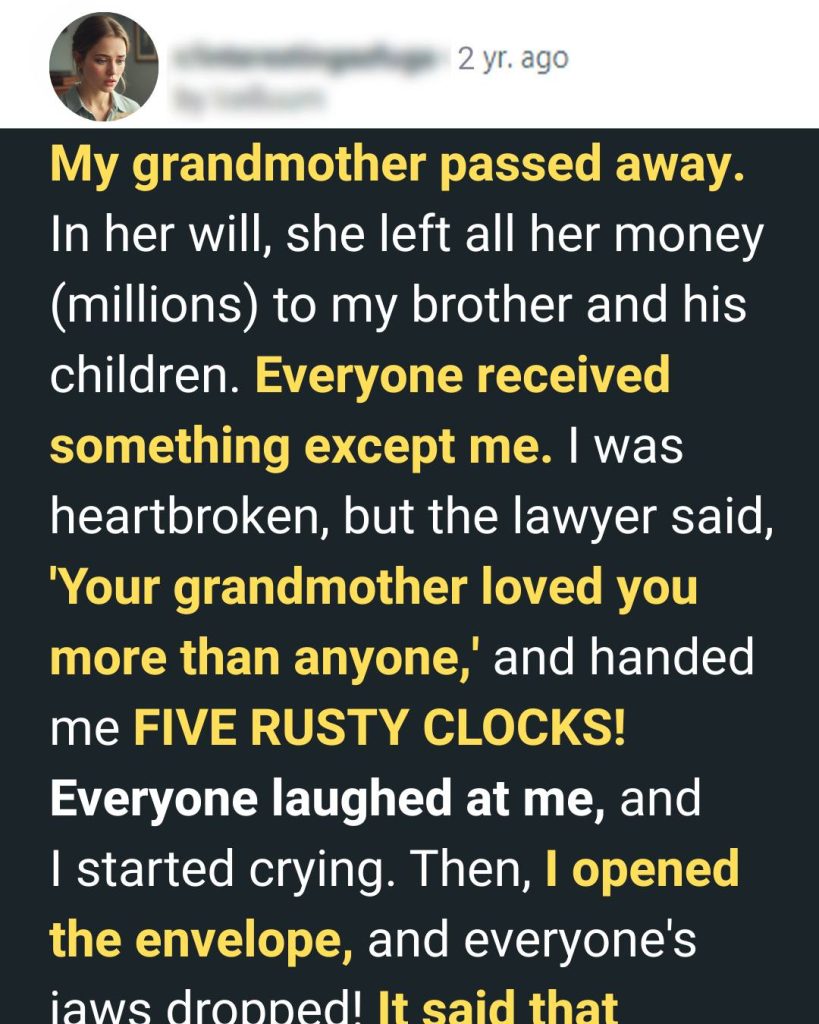 They Laughed When My Grandmother Left Me Five Rusty Clocks—Until I Opened the Envelope…