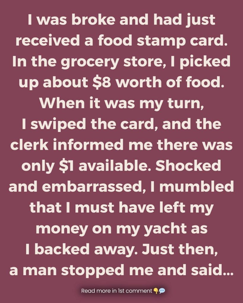 I was broke—truly broke—and had just received my food stamp card. That small piece of plastic felt like both a lifeline and a reminder of how far I had fallen. At the grocery store, I carefully gathered about eight dollars’ worth of food: a loaf of bread, some soup, and a few basics to stretch through the week.
