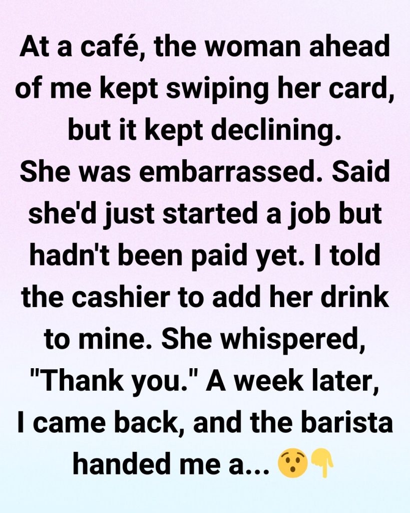 A week later, I swung by the same café on my way to work. I didn’t even get to place my order before the barista grinned at me and held out a cup topped with a perfectly foamed latte. “This one’s on the house,” she said.