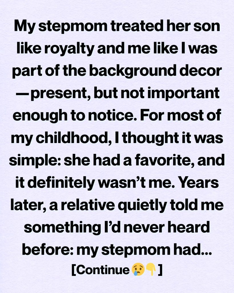 My stepmom treated her son like royalty and me like I was part of the background décor—present, but not important enough to notice. She hovered over him, anticipating every need before he could speak it, while I learned to make myself small in the corners of my own home.