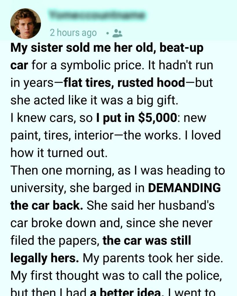 My sister sold me her old, beat-up car for a symbolic price. The thing hadn’t run in years—flat tires that looked like pancakes, a hood eaten by rust, and an interior that smelled like dust and abandonment. Still, she handed me the keys with a dramatic flourish, acting as if she were giving me some priceless heirloom instead of something the junkyard would’ve rejected.