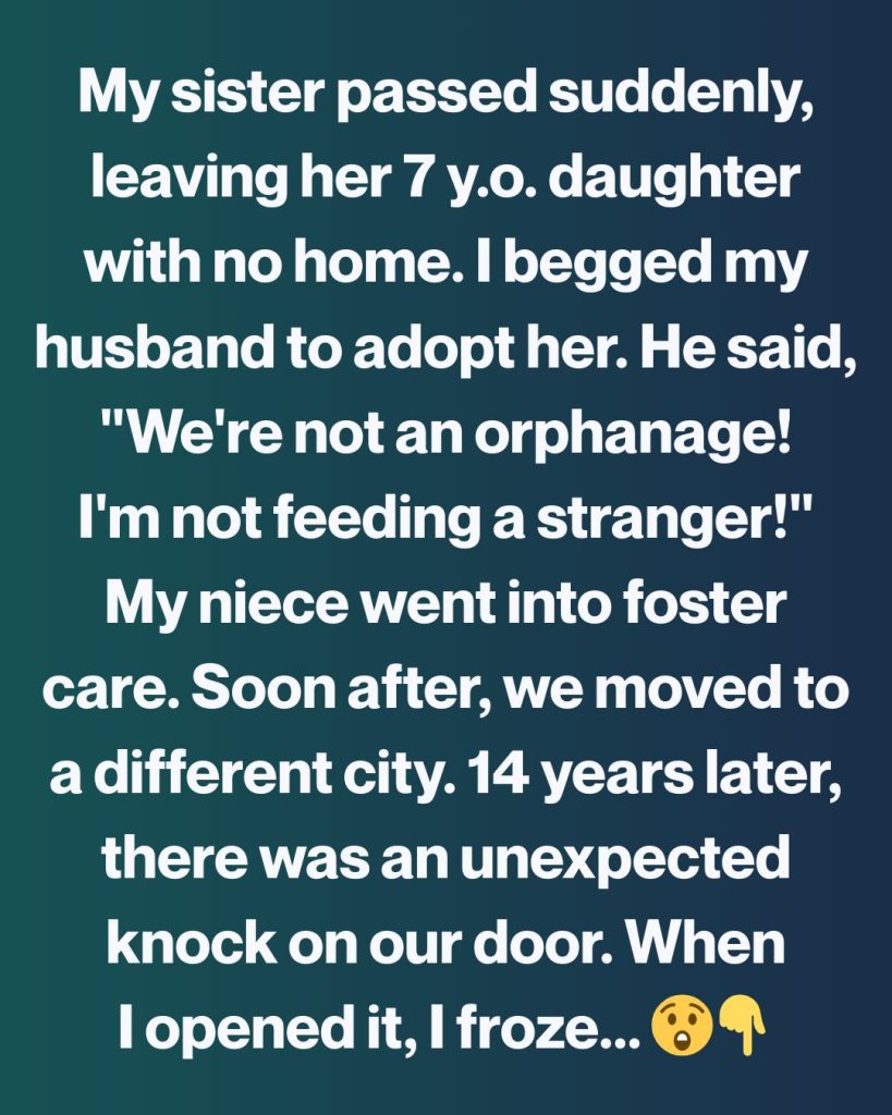 And suddenly, her seven-year-old daughter had no one left in the world but me. I begged my husband to adopt her. I held his hands, cried, pleaded.