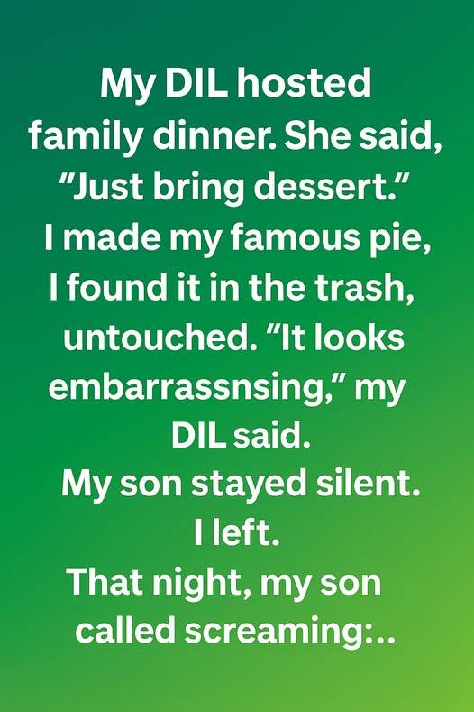 My daughter-in-law hosted a beautiful family dinner, warm lights and soft music filling the room. She told me kindly, “Just bring dessert,” so I prepared my favorite pie, the one everyone used to ask for. When I arrived, I placed it proudly on the counter, excited to share.