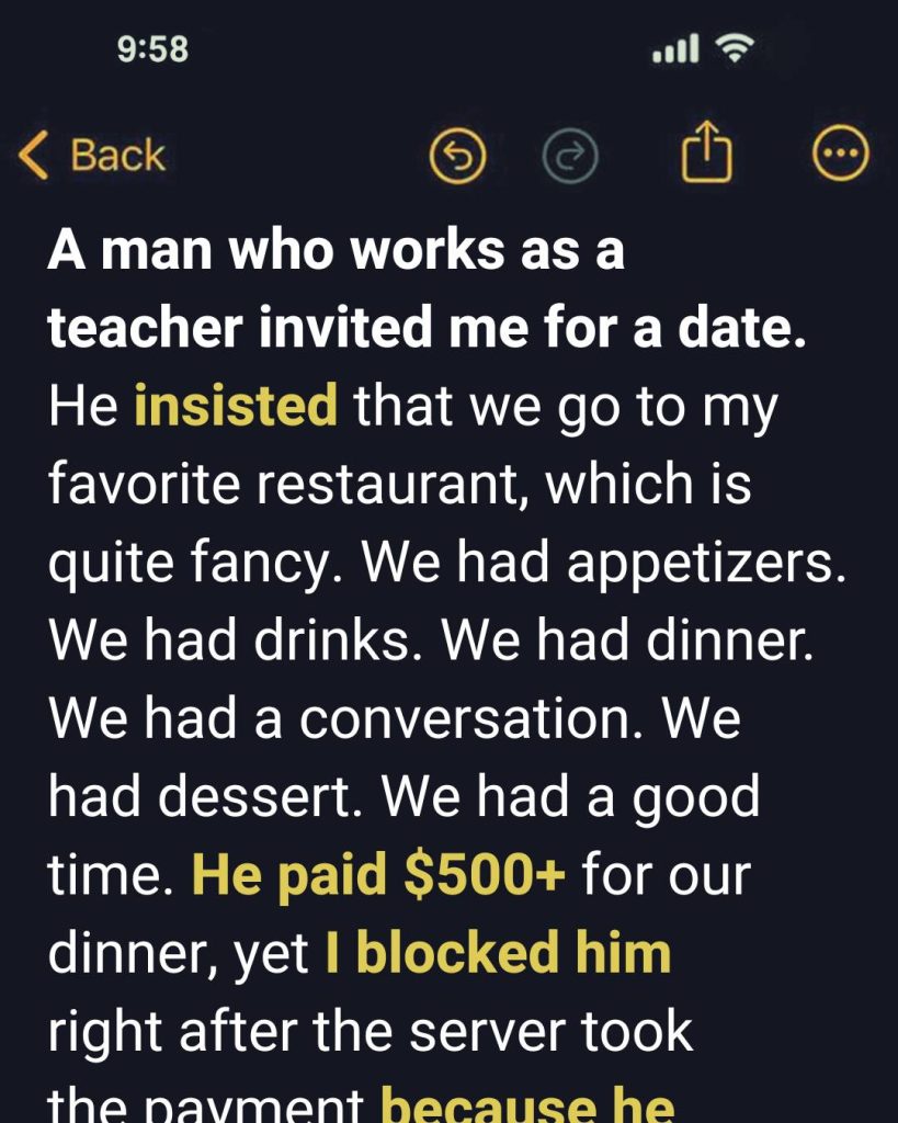She thanked him politely after the date, went home… and blocked him. Immediately.