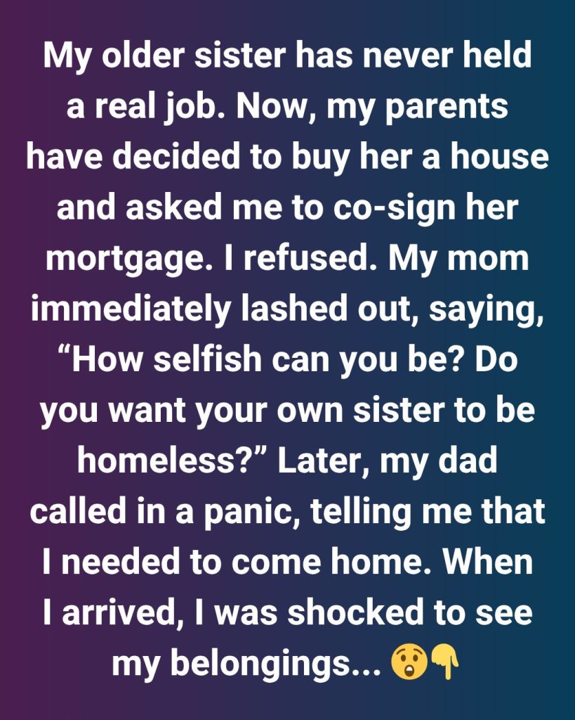 My older sister (27) has never held a real job—she’s always been financially dependent on our parents. Now, they’ve decided to buy her a house to “secure her future” and asked me to co-sign her mortgage since I’m financially stable.