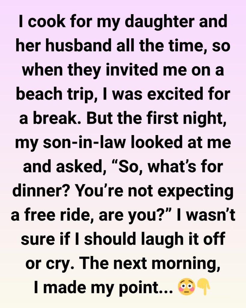 But the moment we arrived, my son-in-law turned to me and said, “So, what’s for dinner? You’re not expecting a free ride, are you?” I wasn’t sure if I should laugh it off or cry.