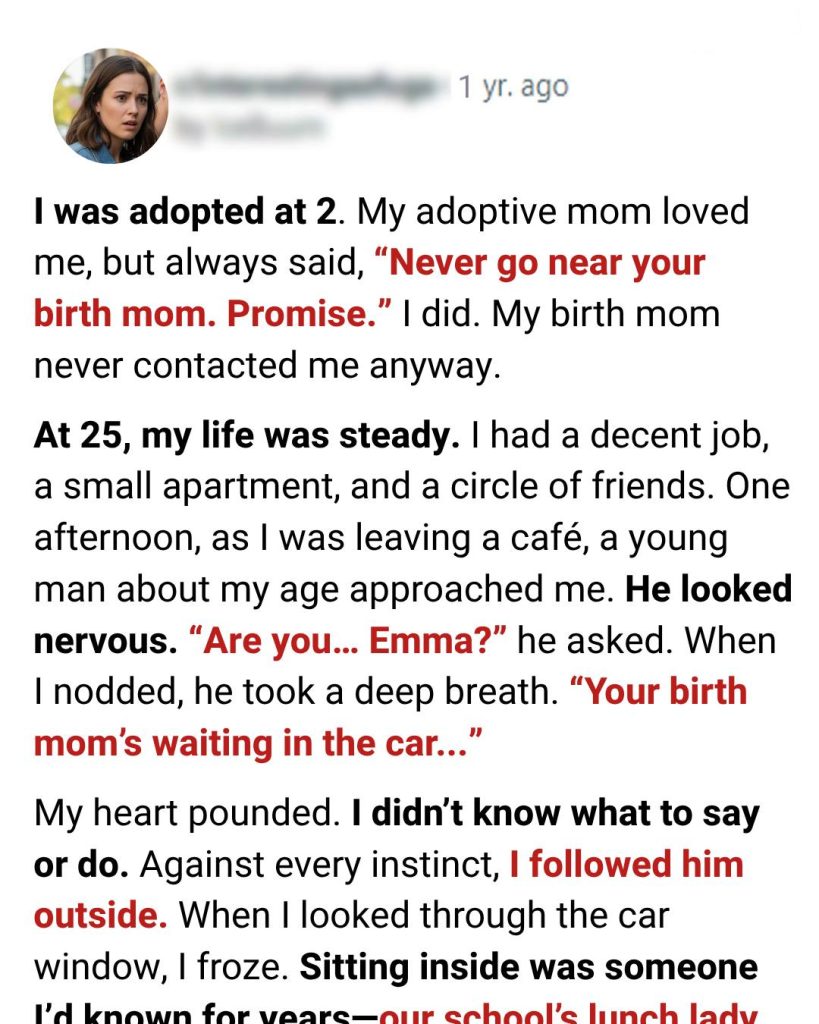My knees went weak. All those years I believed my birth mother had abandoned me—yet she’d been right there, serving me lunch, quietly loving me in secret.