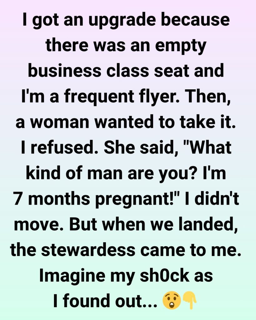 I received an upgrade because there was an empty business class seat, and I’m a frequent flyer. Then, a woman approached and demanded to take the seat. I said no. She replied, “What kind of man are you? I’m seven months pregnant!” I didn’t move and ignored her completely. She went back to her seat.