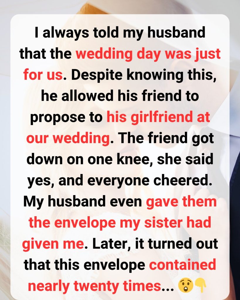 I always told my husband that the wedding day was just for us. Yet, despite knowing this, he allowed his friend to propose to his girlfriend at our wedding. The friend got down on one knee, she said yes, and everyone cheered. My husband even gave them the envelope with the money my sister had given me.