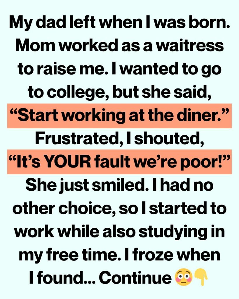 She worked as a waitress at a small diner on the edge of town. I grew up watching her tie her apron before dawn and come home long after dark, her shoes worn thin, the smell of coffee and grease clinging to her clothes. She never talked about being tired, but I saw it—in the way her shoulders slumped when she thought I wasn’t looking, in how she counted every dollar before paying the bills.
