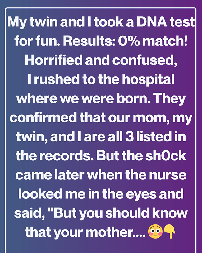 My brother and I are fraternal twins—at least, that’s what I believed for my entire life. Growing up, we were told we shared everything: a birthday, a childhood, a bond that only twins could understand. Recently, just for fun, we decided to take one of those DNA tests. We were curious about what similarities and differences we might have, since fraternal twins only share a portion of their genetics, like regular siblings.