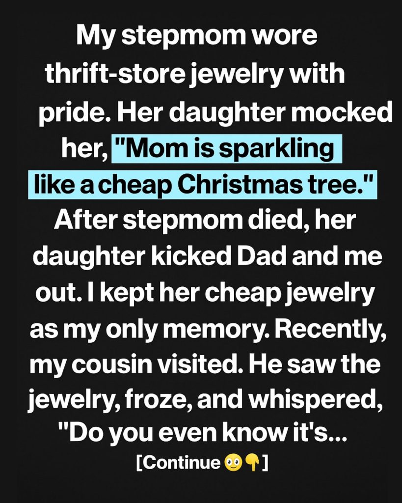 We packed what we could carry. Clothes. Schoolwork. A few family photos my dad insisted on keeping. And on my way out the door, I grabbed the small metal tin my stepmom always kept on her dresser—her jewelry box. I didn’t mean to take anything valuable. I just… needed something of hers. Something that still smelled faintly like lavender and the lotion she used every night.